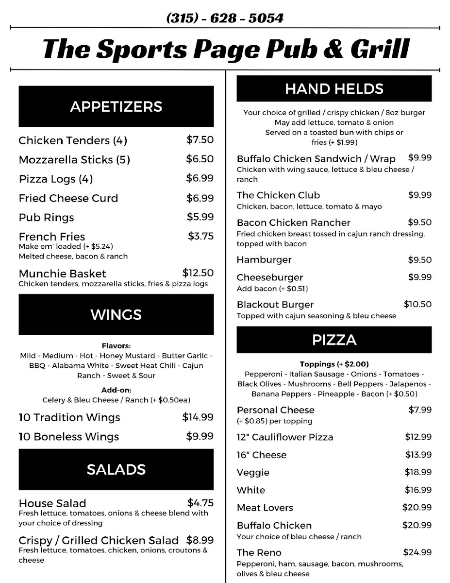 Welcome to The Sports Page Pub and Grill, a cherished gem located at 128 Commercial St, Theresa, NY. This lively venue stands out not just for its hearty menu but also for the warm, inviting atmosphere created by its personable staff.